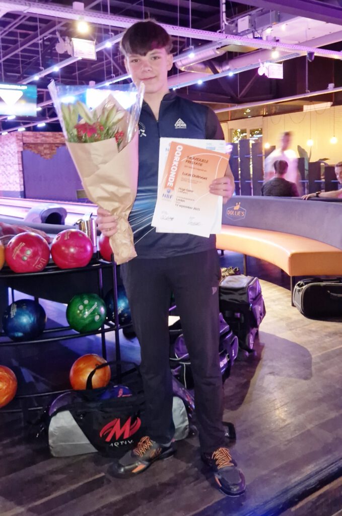 Op dinsdagavond 18 november hebben we Lucas een oorkonde mogen overhandigen voor zijn 299 game, welke hij gegooid heeft op 12 sept. tijdens de Dutch Youth Masters te Leiden.